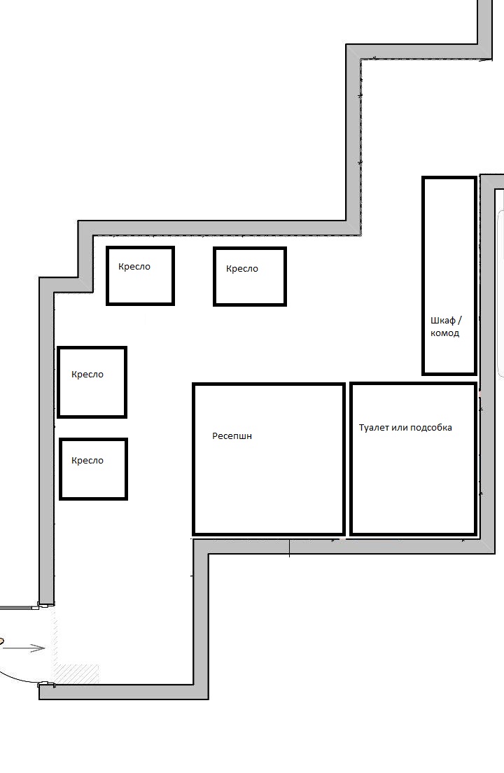 Начну с холла, зал ожидания, в нем предусмотрена стойка администрации (надо уместить стол с принтером, папками, кофе-машиной), тв, кресла для клиентов, столик для клиентов, комод или шкаф, пока не решили.