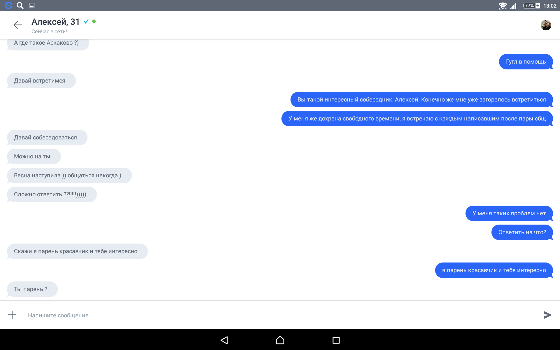 Я тоже на таких сайтах от скуки сижу. Порой попадаются реально адекватные собеседники, с которыми приятно общаться